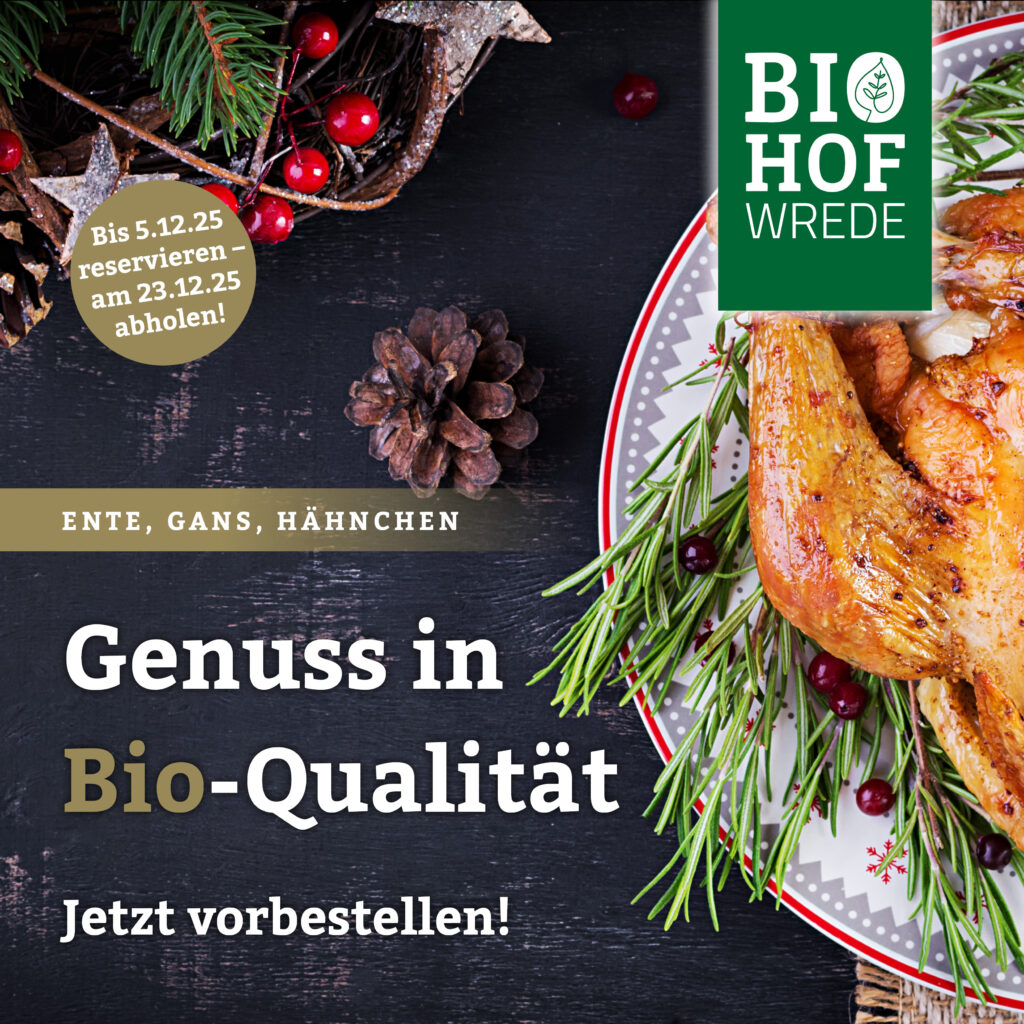 Liebe Kundinnen und Kunden, aufgrund der großen Nachfrage in den letzten Jahren freuen wir uns, euch in diesem Jahr erstmals als „Abholpunkt“ Bio-Geflügel zu Weihnachten anbieten zu können.Unser Lieferant Biofleisch Schröder beliefert uns mit hochwertigem Geflügel von ausgewählten, biozertifizierten Höfen: Alle Tiere werden artgerecht gehalten – mit viel Auslauf, ausgewogenem Bio-Futter und ohne den Einsatz